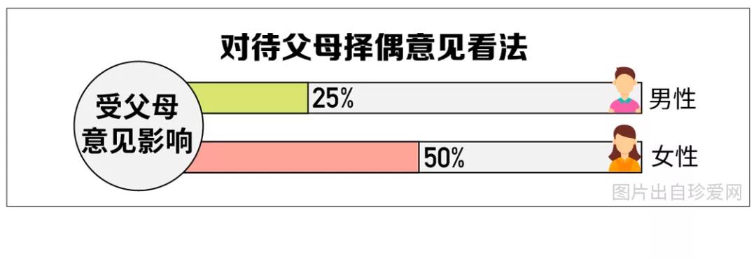 面對父母的擇偶建議,50%的女性會受到父母意見影響,僅25%的男性會受到影響,可見,女性比男性更“聽媽媽的話”。另外,從地域來看,“本地土著”青年更容易受到父母的影響。
