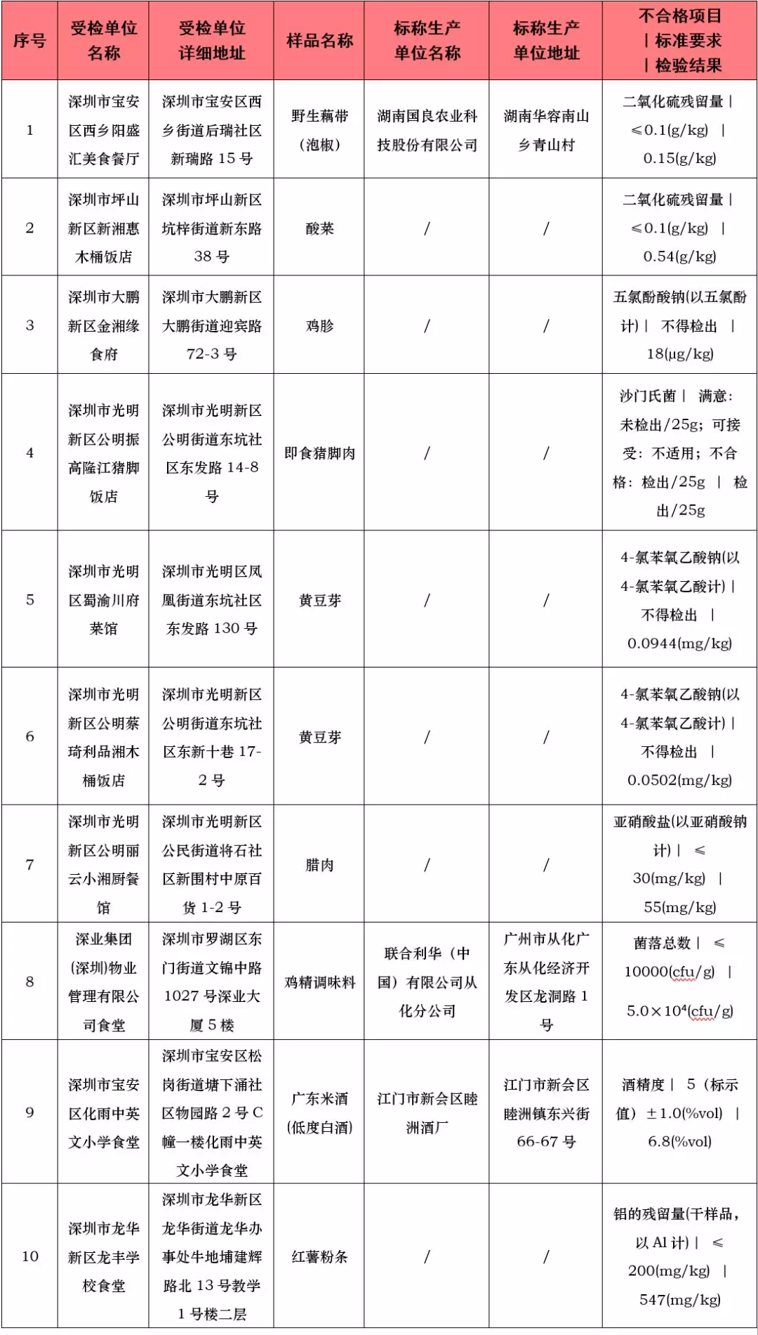 在這次抽檢中,有一批次即食豬腳肉被檢出不合格,受檢單位是深圳市光明新區(qū)公明振高隆江豬腳飯店,項目為沙門氏菌。