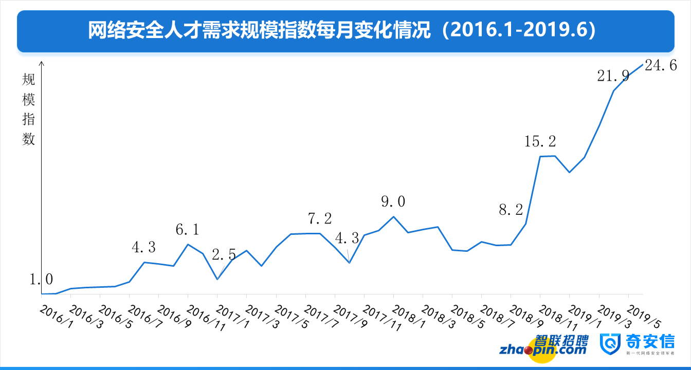 根據(jù)智聯(lián)招聘網(wǎng)絡安全人才大數(shù)據(jù)顯示,2019年6月網(wǎng)絡安全人才市場需求的規(guī)模達到2016年1月需求的24.6倍,相比2018年7月也增長了3倍,增長速度堪稱驚人!