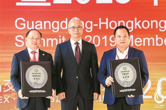 ▲2019年8月8日,中國國際貿(mào)易促進委員會機械行業(yè)分會會長孫喜田(中)向張耀華(右一)授予粵港澳先進制造業(yè)產(chǎn)業(yè)聯(lián)盟主席牌匾。