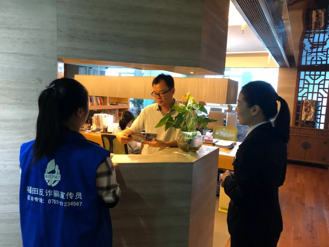 上午10時,深圳市公安局福田分局派出“藍馬甲”宣傳隊走入大中華國際交易廣場,逐層逐戶向企業(yè)員工們派發(fā)反詐騙宣傳單及《福田反詐騙教育????!八{馬甲”宣傳隊員走進各企業(yè)辦公室,向企業(yè)員工派發(fā)相關資料,講解反詐騙知識。各企業(yè)員工積極參與,與“藍馬甲”講師頻頻互動,并認真學習反詐騙技巧,努力提升自身反詐騙能力。