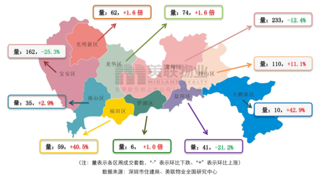 各區(qū)具體成交量及環(huán)比增減幅度差異明顯。其中龍崗成交233套,雖環(huán)比下降12.4%,但總量仍居全市首位;寶安成交162套,位居全市第二位,成交量環(huán)比下降25.3%。此外,龍華和光明并列成為上周一手住宅成交量環(huán)比上升幅度最大的區(qū)域,均增長(zhǎng)1.6倍,分別增至74和62套。而羅湖區(qū)盡管成交套數(shù)也大幅增長(zhǎng)達(dá)1倍,但是羅湖區(qū)新房較少,即使增長(zhǎng)一倍也僅有6套成交。