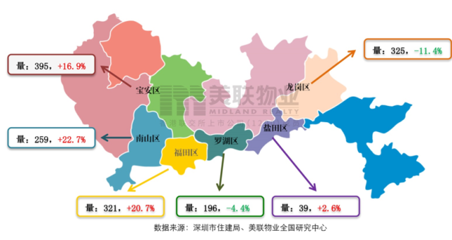 分區(qū)域來(lái)看,上周寶安、龍崗、福田三區(qū)成交套數(shù)均達(dá)300套以上。其中,羅湖、龍崗兩區(qū)二手住宅成交套數(shù)環(huán)比下降,其余四區(qū)上周二手住宅成交環(huán)比均上升。寶安區(qū)與龍崗區(qū)成交套數(shù)互換位次,寶安區(qū)以近400套的成交量居于全市首位,環(huán)比上升16.9%;龍崗成交325套,位居全市第二位,環(huán)比下降11.4%。此外,南山成為上周二手住宅成交量漲幅最大的區(qū)域,環(huán)比上升22.7%至259套。