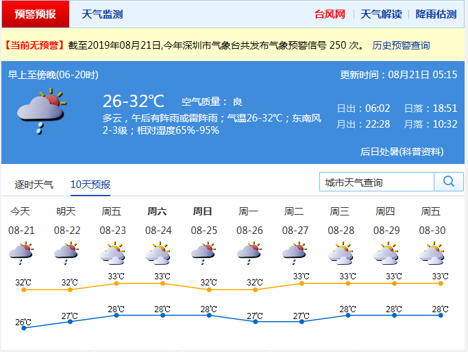 見圳客戶端·深圳新聞網(wǎng)2019年8月21日訊(見圳客戶端·深圳新聞網(wǎng)記者 高暢韻)記者從市氣象局了解到,昨日我市白天最高氣溫31 ℃ -33 ℃,中北部最高氣溫達(dá)到35 ℃。今日多云,有(雷)陣雨;22-24日多云間晴天,局部有短時(shí)(雷)陣雨,部分地區(qū)最高氣溫可達(dá)35 ℃左右;25-26日有(雷)陣雨,氣溫有所回落。