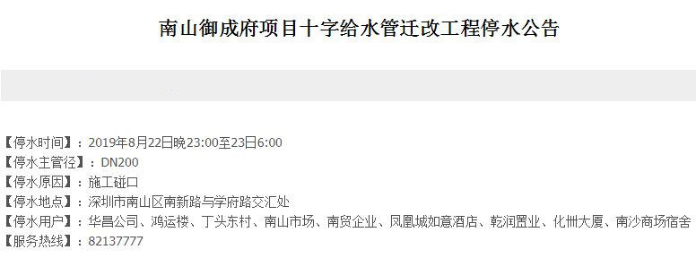 停水時(shí)間:2019年8月22日晚23:00至23日6:00