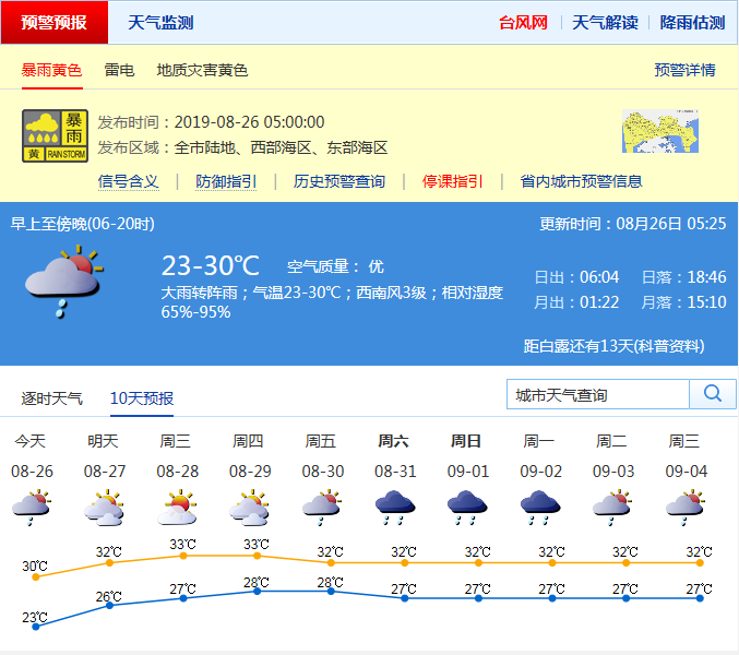 見(jiàn)圳客戶(hù)端·深圳新聞網(wǎng)2019年8月26日訊 今年第11號(hào)臺(tái)風(fēng)“白鹿”已經(jīng)于昨日7時(shí)25分在福建省東山縣沿海登陸后,已減弱為熱帶低壓,向西偏北方向移動(dòng),市氣象臺(tái)已于昨日17時(shí)取消臺(tái)風(fēng)白色預(yù)警信號(hào)。據(jù)市氣象局預(yù)計(jì),今日白天大雨轉(zhuǎn)陣雨,降雨減弱;27-29日多云間晴天,天氣趨于悶熱。