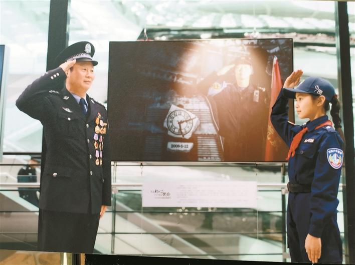 ▲廣東公安百名英模肖像攝影展中,傅建文(左)在現(xiàn)場解說照片由來。