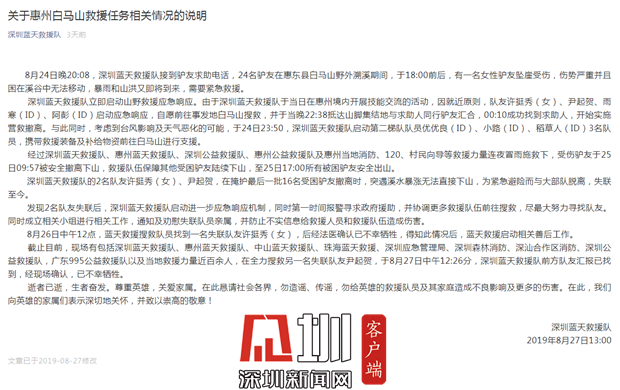 見圳客戶端?深圳新聞網(wǎng)2019年8月30日訊(見圳客戶端、深圳新聞網(wǎng)記者 張玲)8月27日下午,深圳藍天救援隊發(fā)布消息稱:8月25日,救援隊兩名隊友在掩護最后一批受困驢友撤離時,突遇溪水暴漲無法直接下山,為緊急避險而與大部隊脫離失聯(lián)。8月27日中午,最終將兩名隊友找回,經(jīng)確認,兩名隊員許挺秀(女)、尹起賀已不幸犧牲。