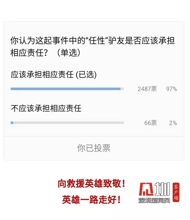 有一個細節(jié)是,這批受困的驢友上山溯溪的時間正是深圳發(fā)布臺風預警信號的時間,因此很多人也認為在臺風天探險,驢友過于任性。在深圳新聞網(wǎng)微信公眾號發(fā)起的小調查(你認為這起事件中的“任性”驢友是否應該承擔相應責任?(單選))中,共有2553名網(wǎng)友作答,97%的人認為應該承擔相應責任。