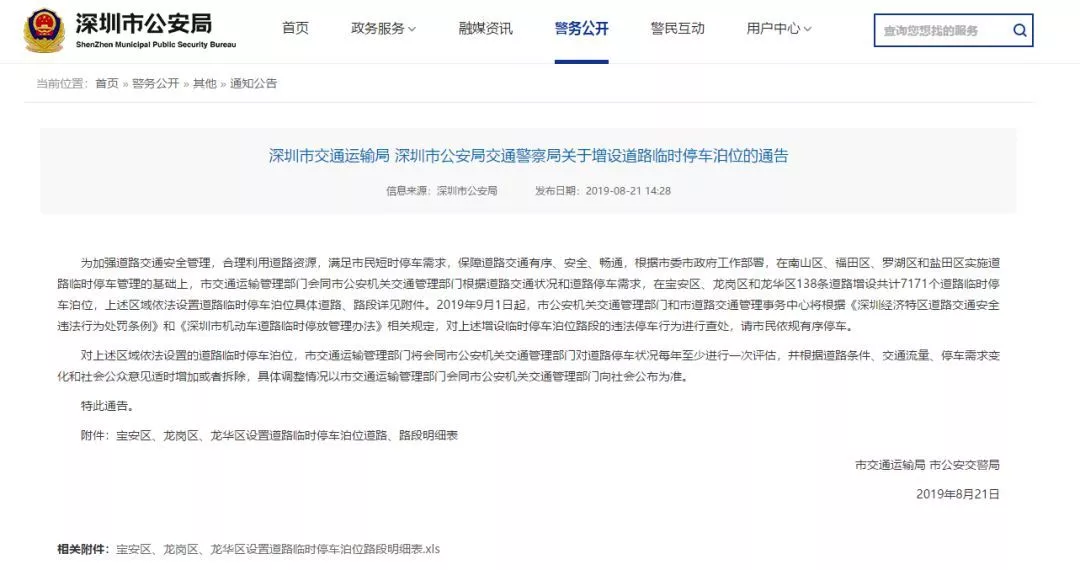 據(jù)悉,2019年9月1日起,市公安機關交通管理部門和市道路交通管理事務中心將根據(jù)《深圳經(jīng)濟特區(qū)道路交通安全違法行為處罰條例》和《深圳市機動車道路臨時停放管理辦法》相關規(guī)定,對上述增設臨時停車泊位路段的違法停車行為進行查處,請市民依規(guī)有序停車。