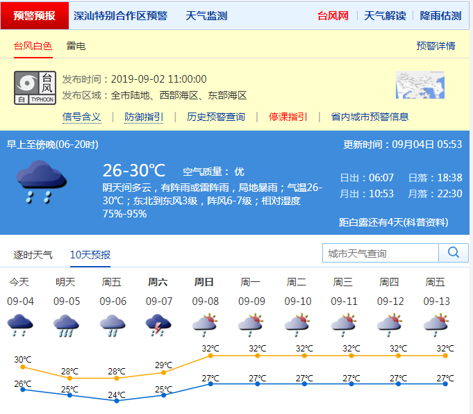 見圳客戶端.深圳新聞網(wǎng)2019年9月4日訊 據(jù)深圳市氣象臺消息,臺風(fēng)“劍魚”3日17時減弱為熱帶低壓,目前其風(fēng)力進一步減弱,已很難確定其環(huán)流中心,中央臺4日02時對其停止編號。預(yù)計本周深圳多降雨,深圳(含深汕)4-5日有雷陣雨,局部暴雨,沿海和海區(qū)最大陣風(fēng)6-7級。