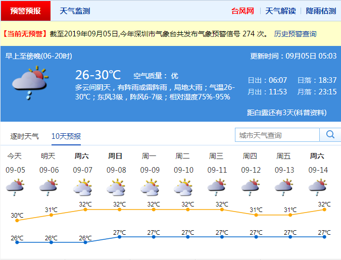 見圳客戶端、深圳新聞網(wǎng)2019年9月5日訊 今年14號(hào)臺(tái)風(fēng)“劍魚”(熱帶風(fēng)暴級(jí))3日17時(shí)減弱為熱帶低壓后,其風(fēng)力進(jìn)一步減弱,已難以確定其環(huán)流中心,中央氣象臺(tái)于4日2時(shí)停止對(duì)其編號(hào)。市氣象臺(tái)于4日8時(shí)30分取消臺(tái)風(fēng)白色預(yù)警信號(hào)。盡管如此,受“劍魚”減弱后低壓槽影響,今日我市有大雨局部暴雨,沿海、海區(qū)和高地陣風(fēng)6-7級(jí);6日降雨減弱;7日起轉(zhuǎn)多云,有短時(shí)陣雨,天氣炎熱。