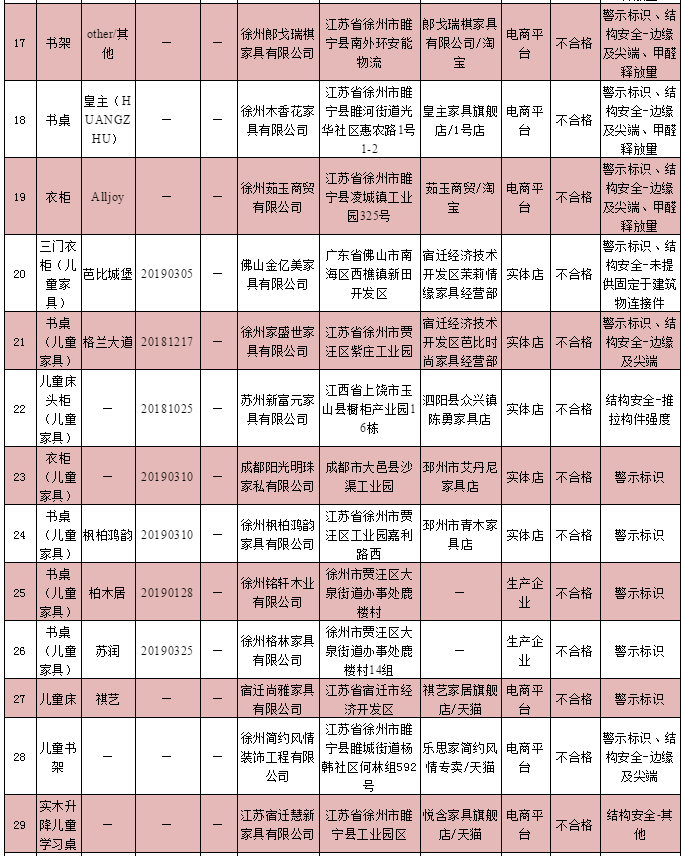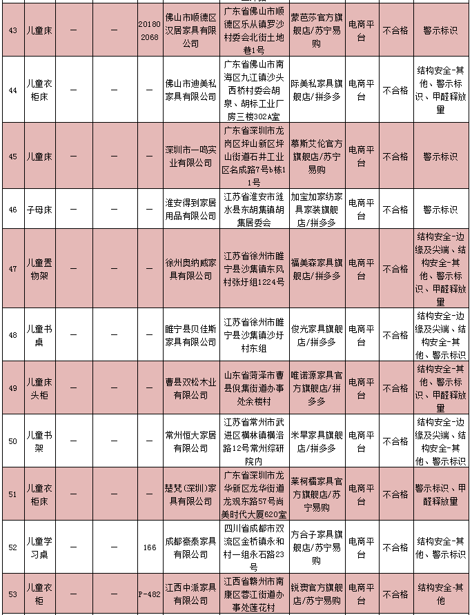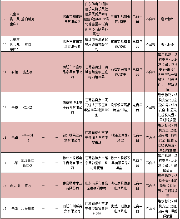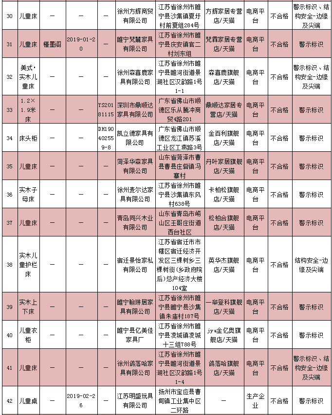 兒童家具產(chǎn)品質(zhì)量監(jiān)督抽查不合格企業(yè)名單