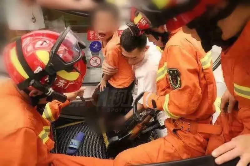 到達現(xiàn)場后,消防人員發(fā)現(xiàn),小孩前腳掌已卡進手扶電梯內,都嚇得大哭。經過消防人員奮力營救,成功救出被卡小孩,交給120救護人員送往醫(yī)院。
