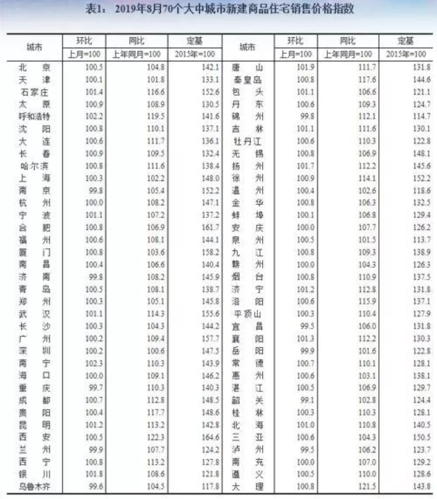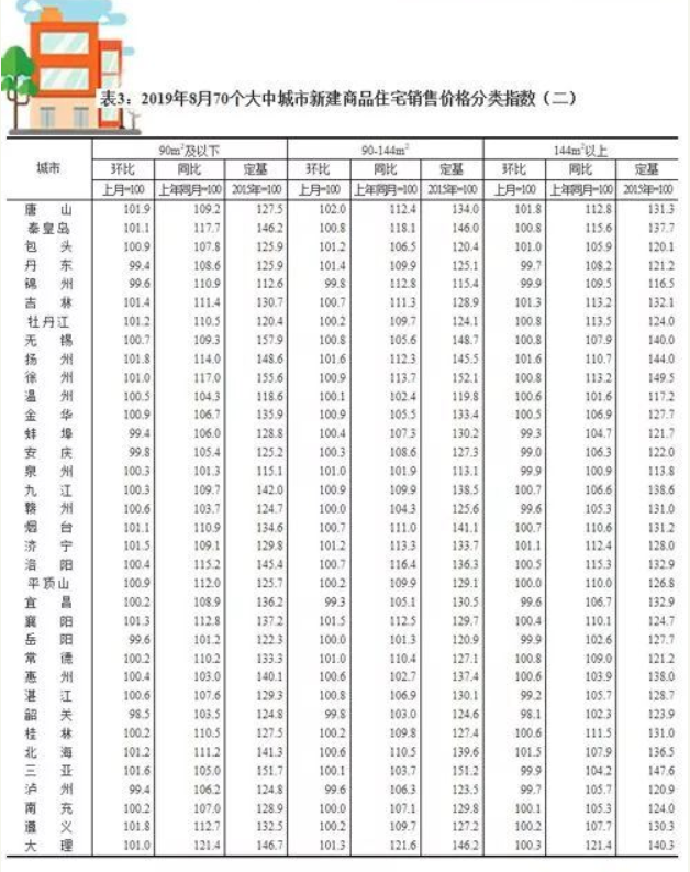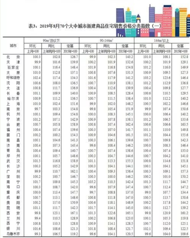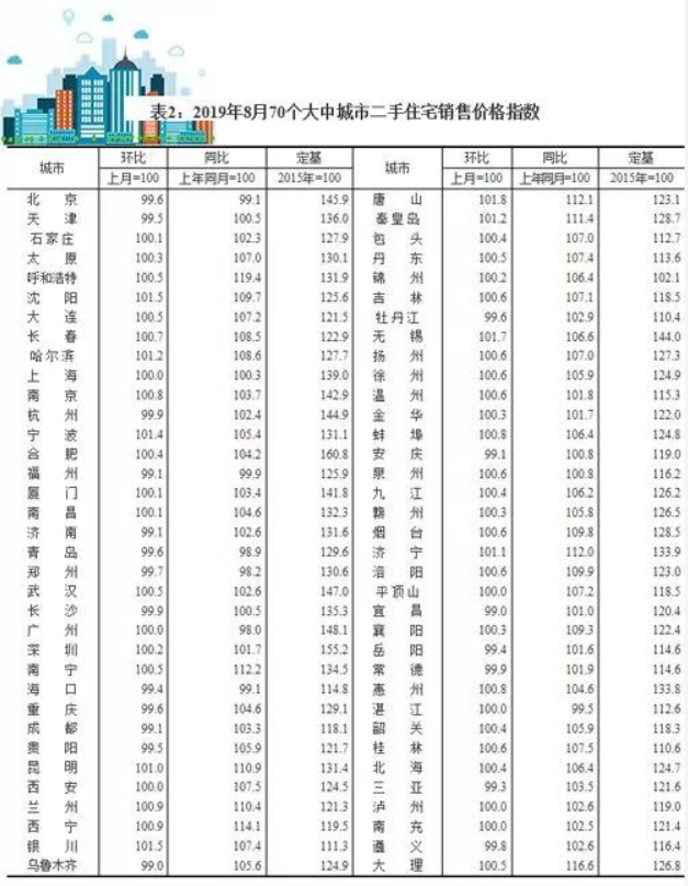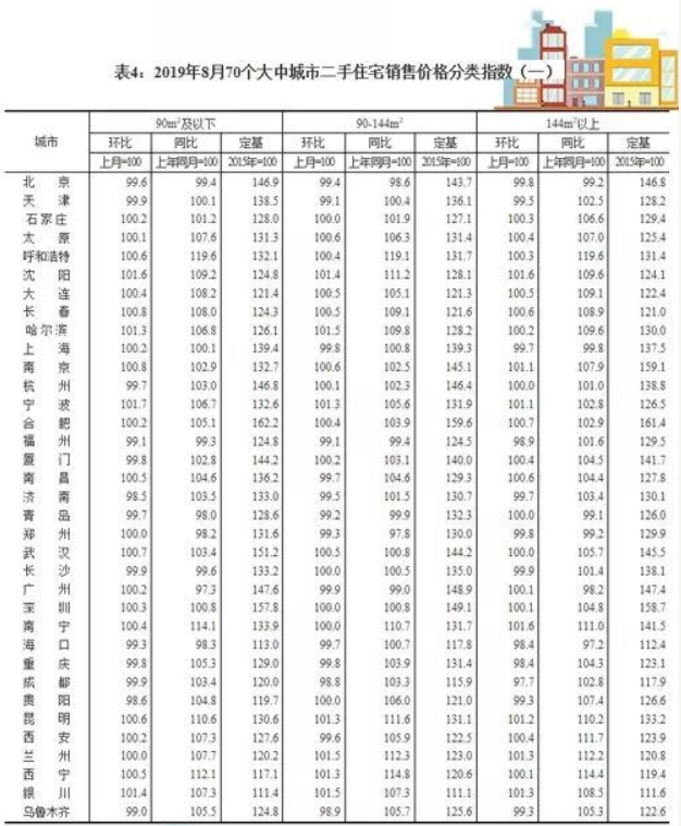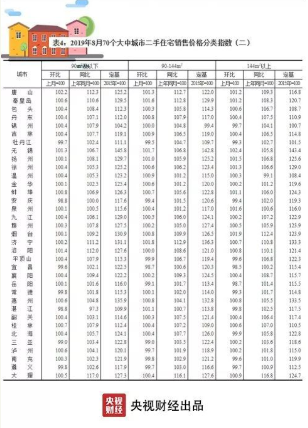 央視財經2019年9月18日訊 近日,國家統(tǒng)計局發(fā)布了8月份70個大中城市商品住宅銷售價格變動情況:一二線城市新建商品住宅和二手住宅銷售價格環(huán)比、同比漲幅均與上月相同或回落;三線城市新建商品住宅銷售價格環(huán)比漲幅與上月相同,二手住宅漲幅微升。