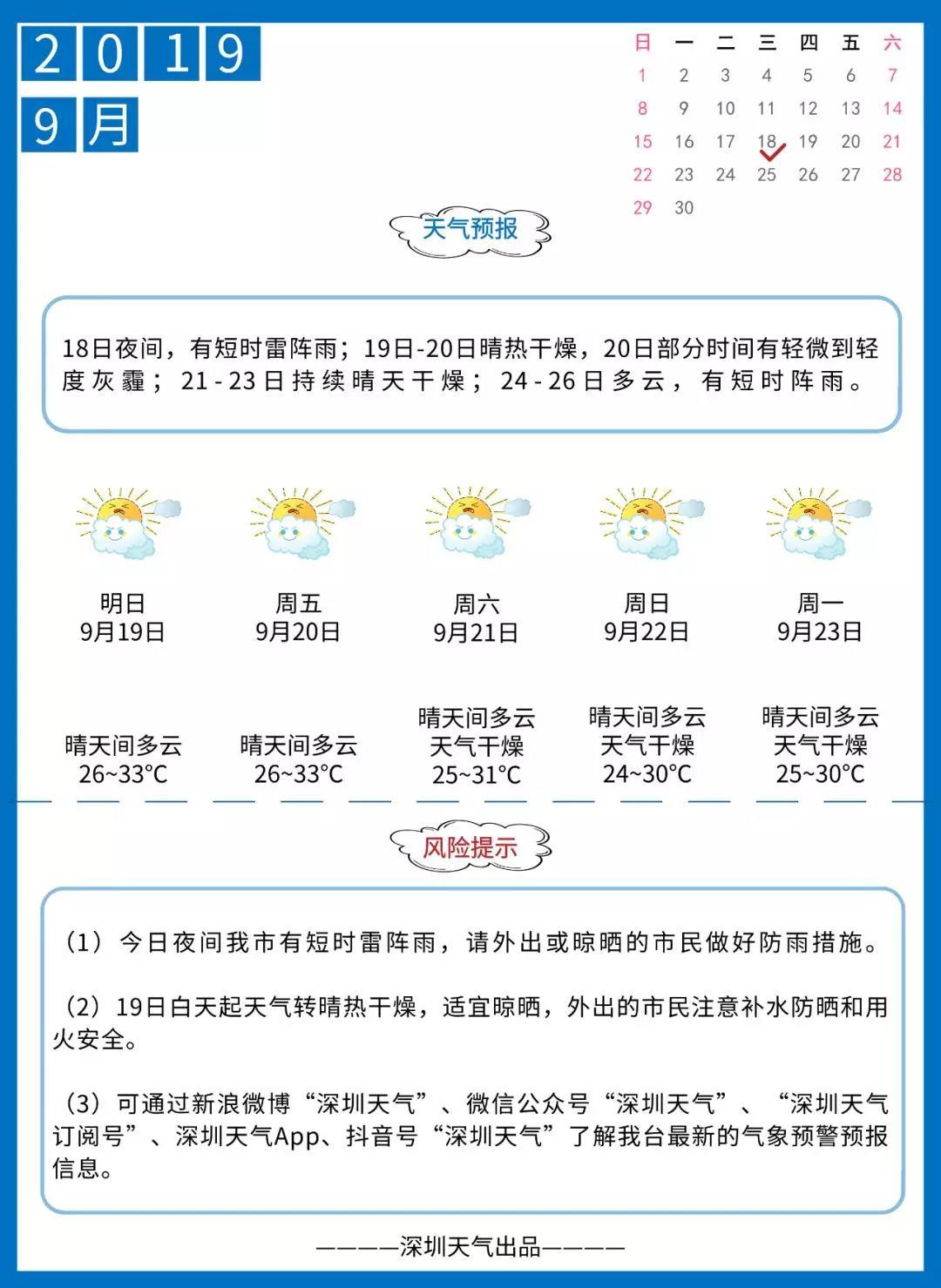 預(yù)計18日夜間有短時雷陣雨,19-20日天氣晴熱干燥,氣溫在26-33℃,20日部分時間有輕微到輕度灰霾,21-23日持續(xù)晴天干燥,24-26日多云,有短時陣雨。深圳天氣提醒市民,今夜外出注意防范局地短時雷雨,明日起外出注意補水防曬和用火安全!