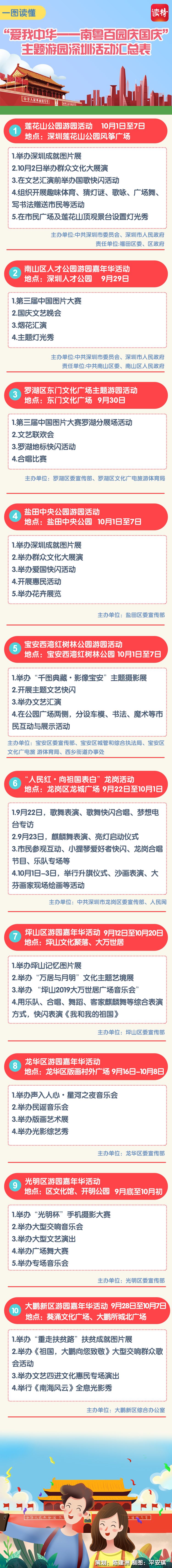 為慶祝中華人民共和國成立70周年,深圳市將舉辦專場音樂會(huì)、群眾文藝晚會(huì)、焰火晚會(huì)等活動(dòng),同時(shí)將舉行10場“愛我中華——南粵百園慶國慶”主題游園及80場“我和我的祖國”國慶群眾文藝嘉年華活動(dòng)。主題游園和文藝嘉年華活動(dòng)安排如下:
