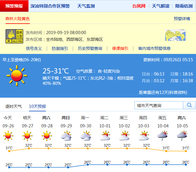 由于近期大氣層結(jié)靜穩(wěn),深圳持續(xù)受偏北下沉氣流控制,近地面風(fēng)力微弱且中西部地區(qū)出現(xiàn)局地風(fēng)向輻合,氣象條件不利于污染物擴散,25日下午中西部地區(qū)出現(xiàn)了輕微到輕度灰霾;預(yù)計入夜后,能見度將逐漸好轉(zhuǎn)。26-30日深圳晴天到多云為主,空氣干燥。26日氣溫25-31℃,陽光充足;展望10月初晴朗干燥天氣持續(xù)。森林火險預(yù)警持續(xù)生效中。
