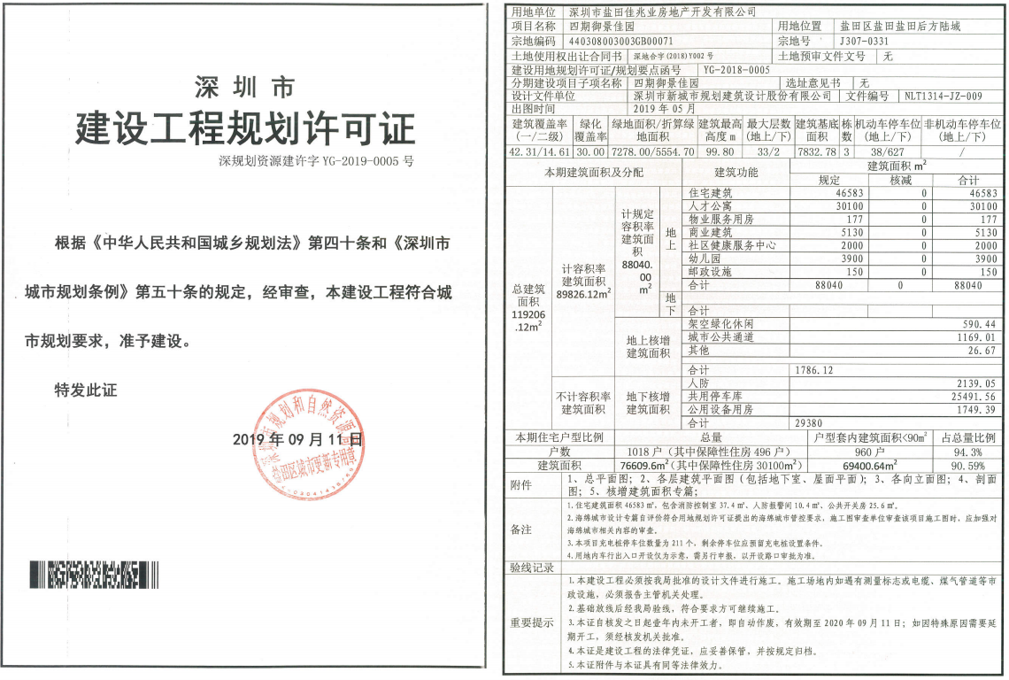 公告顯示,深圳市鹽田佳兆業(yè)房地產開發(fā)有限公司的四期御景佳園項目(鹽田三、四村和西山嚇村整體搬遷項目5號地塊),位于鹽田區(qū)鹽田港后方陸域J307-0331號宗地,用地面積18514.16平方米,允許建設總建筑面積88040平方米,其中住宅46583平方米、人才公寓30100平方米。本期住宅1018戶,其中保障性住房496戶。