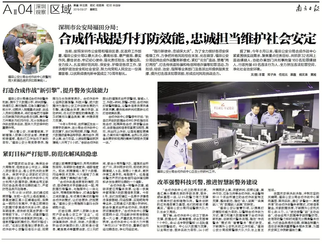 在大慶安保決戰(zhàn)決勝、沖刺攻堅的關(guān)鍵期,福田公安分局合成作戰(zhàn)中心面向基層、面向?qū)崙?zhàn),通過“多警合一、高度共享”的合成作戰(zhàn)警務(wù)新模式,打破信息壁壘,關(guān)聯(lián)數(shù)據(jù)資源,不斷提升公安機關(guān)核心戰(zhàn)斗力,從“被動接警”到“主動出擊”,綜合運用大數(shù)據(jù)等手段預警防范,為在有限的警力和時間里充分提高警務(wù)效能,為打擊各類違法犯罪、保障各種重大活動安保提供重要警務(wù)服務(wù)支撐,為大慶安保工作貢獻福田力量。