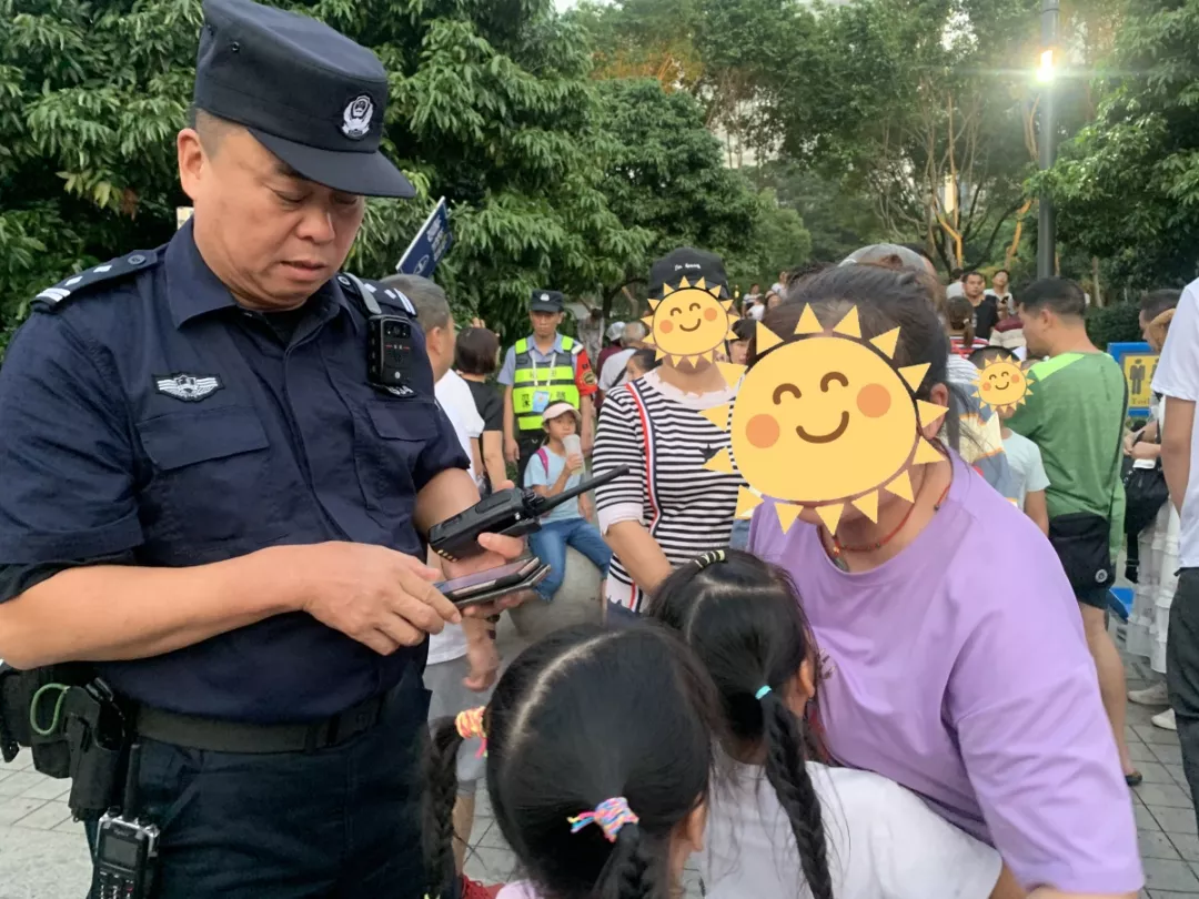 10月2日,深圳市公安局福田公安分局機(jī)動(dòng)訓(xùn)練大隊(duì)五中隊(duì)民警麥炳耀在燈光秀安保執(zhí)勤中,發(fā)現(xiàn)一位走失小孩的母親心急如焚在哭泣,麥炳耀邊安慰她邊向李曉峰副大隊(duì)長(zhǎng)、黃鎮(zhèn)雄副大隊(duì)長(zhǎng)報(bào)告情況,隨后大隊(duì)領(lǐng)導(dǎo)立即通過(guò)對(duì)講機(jī)向現(xiàn)場(chǎng)執(zhí)勤民警和隊(duì)員通報(bào)尋人啟事及人物特征,不久后,對(duì)講機(jī)傳來(lái)好消息,在民警麥炳耀帶領(lǐng)輔警張世鵬尋尋找下,終于在東廣場(chǎng)東北出入口處找到走失的兩個(gè)小孩并迅速通知小孩母親前來(lái)帶回。