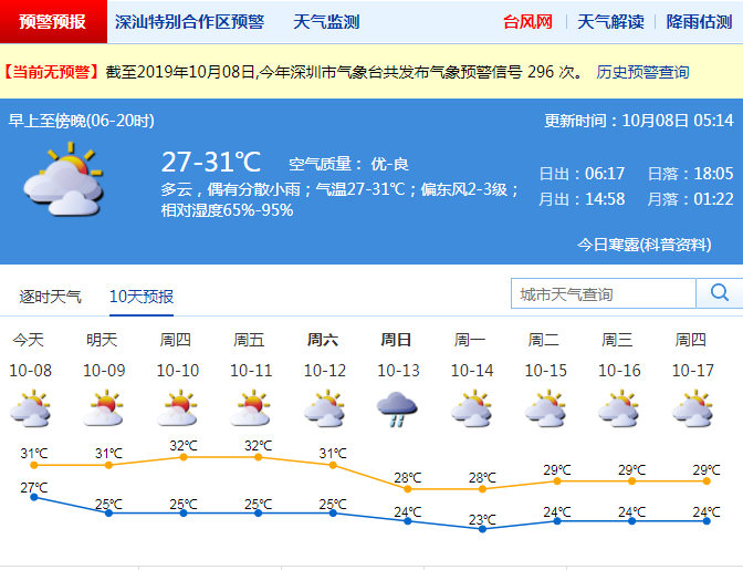 見圳客戶端·深圳新聞網(wǎng)2019年10月08日訊 據(jù)深圳市氣象局消息,今天深圳多云,偶有分散小雨;氣溫27-31℃;偏東風(fēng)2-3級;相對濕度65%-95%。