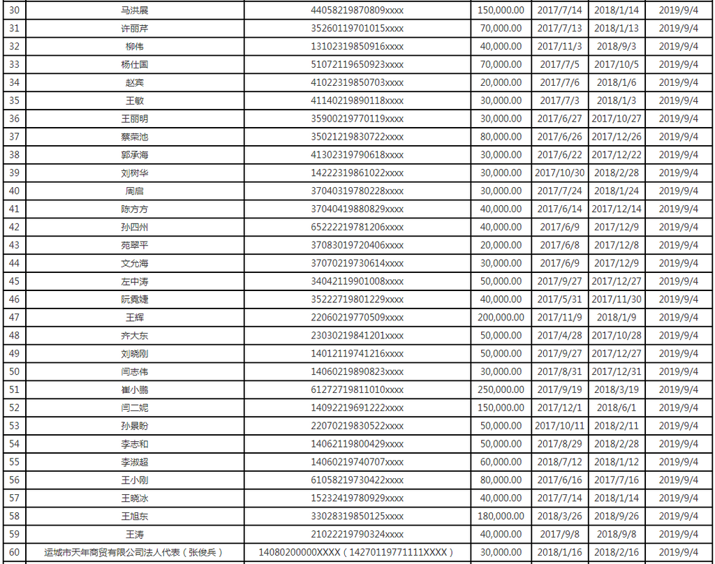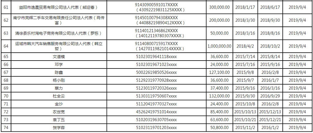 據(jù)深圳市地方金融監(jiān)督管理局披露的網(wǎng)絡(luò)借貸信息中介機構(gòu)失信人信息表顯示,74名失信網(wǎng)貸借款人中,有5名是企業(yè)的法人代表,分別為運城市天年商貿(mào)有限公司法人代表張俊兵、益陽市逸晨貿(mào)易有限公司法人代表熊迎春、南寧市亮輝二手車交易有限責(zé)任公司法人代表肖傳富、清徐縣樂村淘電子商務(wù)有限公司法人代表羅棟及運城市韓大汽車銷售服務(wù)有限公司法人代表韓立哲。其中,運城市韓大汽車銷售服務(wù)有限公司法人代表韓立哲逾期金額居首,達到了100萬元,借款時間是2018年4月2日,逾期開始時間是2018年10月2日,截至2019年10月9日已逾期一年多。