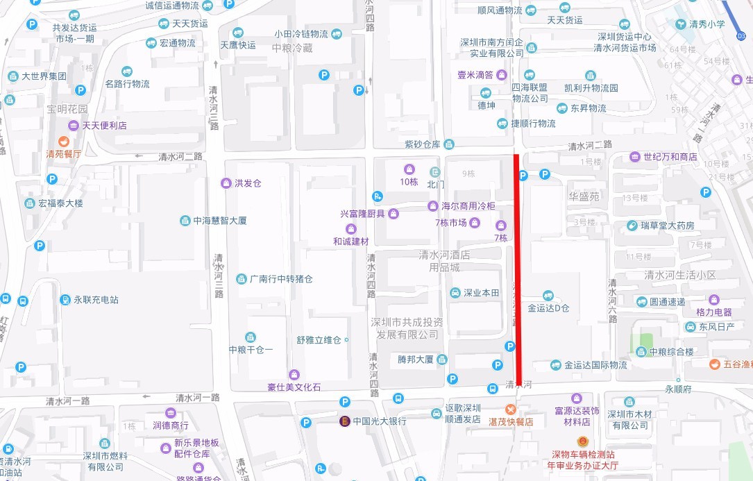 因地鐵14號線清水河站工程施工需要,2019年10月29日至2020年4月26日共180天,封閉清水河五路(清水河一路至清水河二路段)進行施工。原經(jīng)此路段通行的車輛,可改沿清水河四路或周邊其它道路通行。2019年10月29日至2020年4月26日共180天,清水河五路(清水河二路至環(huán)倉路段)由南北雙向通行調(diào)整為由南向北單向通行。2019年10月29日至2020年4月26日共180天,清水河二路(深圳物流集團有限公司內(nèi)部通道至清水河五路段)由東西雙向通行調(diào)整為由西向東單向通行。2019年10月29日至2020年4月26日共180天,環(huán)倉路(清水河五路至深圳物流集團有限公司內(nèi)部通道段)由東西雙向通行調(diào)整為由東向西單向通行。