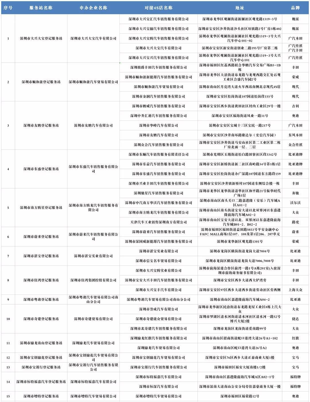 據(jù)悉,2019年9月2日,深圳市交管部門選定15家新車登記服務(wù)站、5家二手車登記服務(wù)站為第一批快捷代辦登記試點(diǎn),各試點(diǎn)可以備案多家沒(méi)有服務(wù)站的4S店(需將資料交至車管所備案)。
