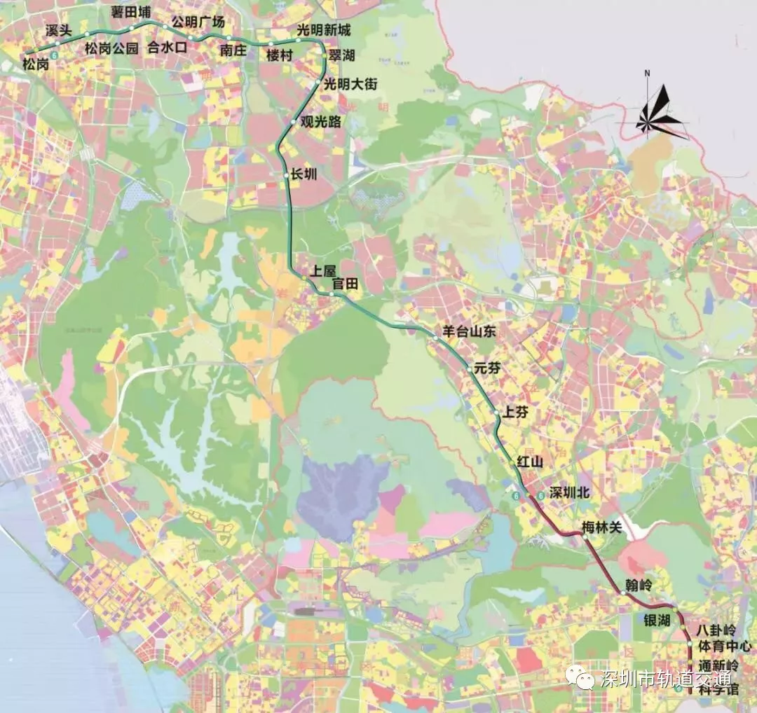 站點(diǎn):科學(xué)館、通新嶺、體育中心、八卦嶺、銀湖、翰嶺、梅林關(guān)、深圳北、紅山、上芬、元芬、羊臺(tái)山東、官田、上屋、長圳、觀光路、光明大街、翠湖、光明新城、樓村、南莊、公明廣場、合水口、薯田埔、松崗公園、溪頭、松崗