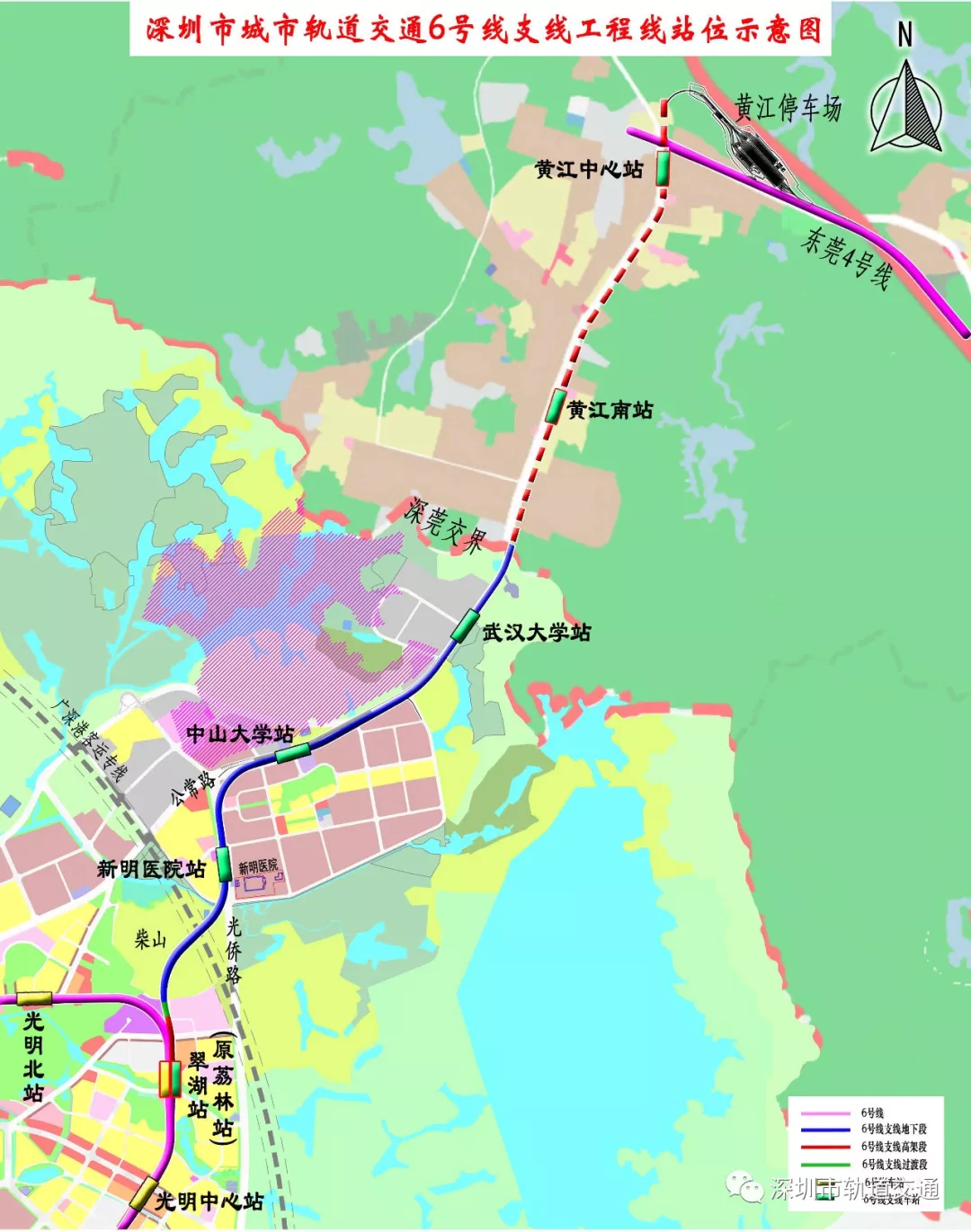 地鐵6號線支線位于深圳市光明區(qū),線路起點(diǎn)設(shè)置于6號線翠湖站(不含土建部分)東側(cè),線路終點(diǎn)設(shè)置于公常路深莞邊界東莞黃江鎮(zhèn),共設(shè)3站4區(qū)間。其中翠湖站為6號線支線與6號線的換乘站。