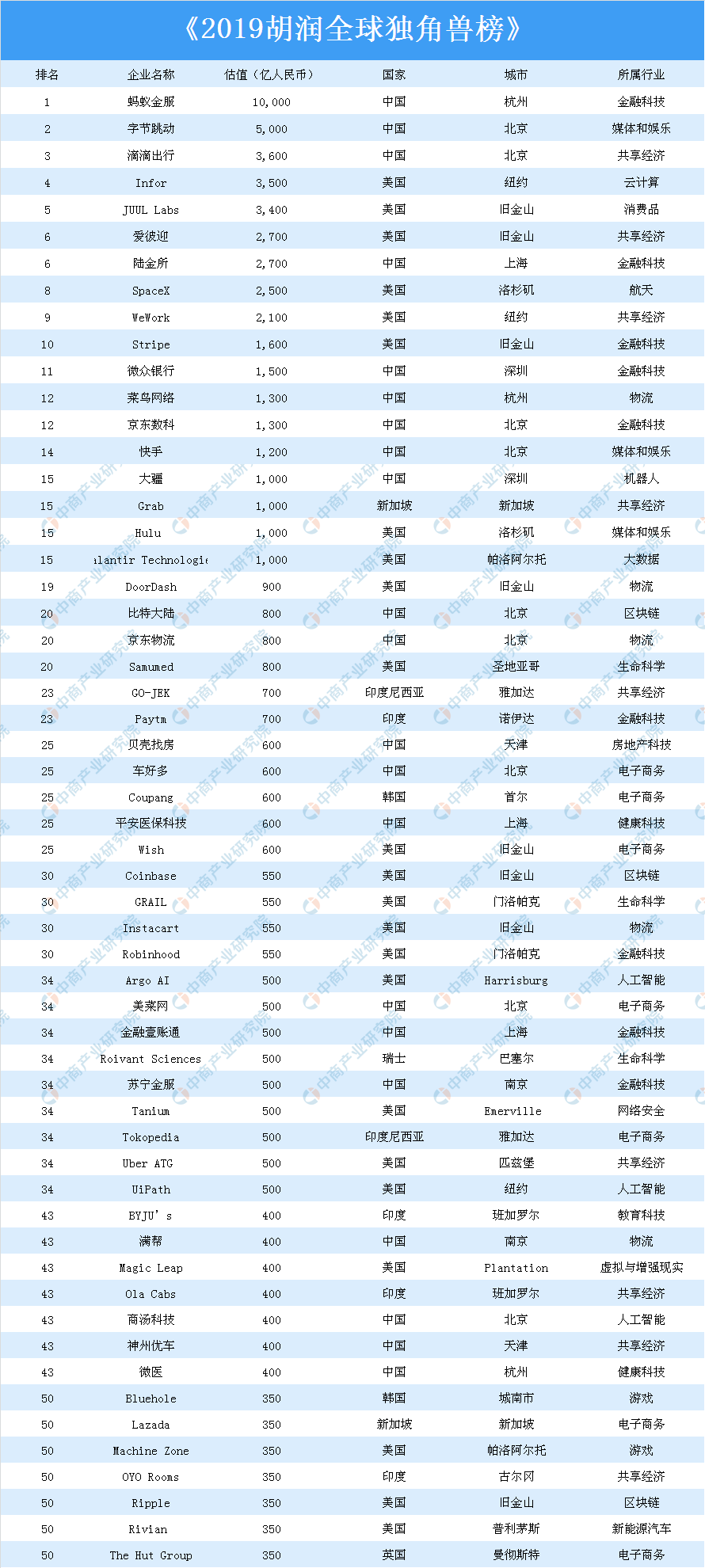 據悉,這是胡潤研究院首次發(fā)布全球獨角獸榜。此次榜單對全球估值10億美元以上的科技初創(chuàng)企業(yè)排名,上榜企業(yè)要求創(chuàng)辦不超過10年,獲得過私募投資且未上市。本次榜單估值計算截止日期為2019年6月30日。
