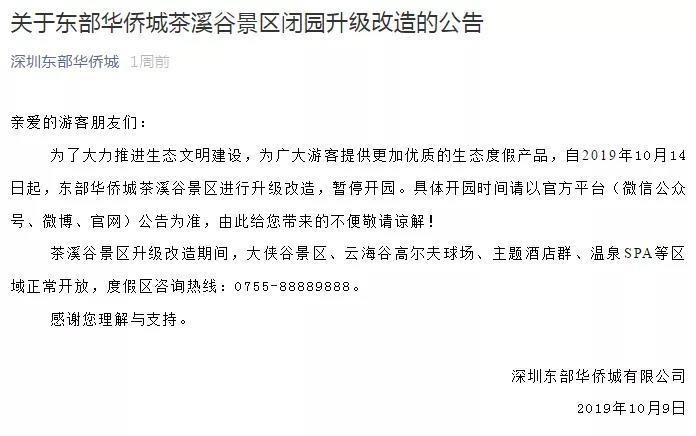 據(jù)深圳東部華僑城官方微博消息,自2019年10月14日起,東部華僑城茶溪谷景區(qū)進(jìn)行升級改造,暫停開園。