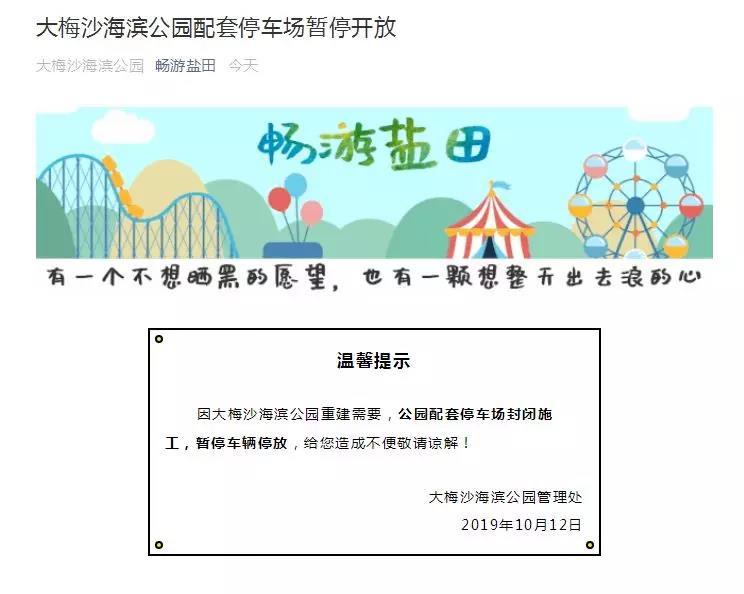 另外,大梅沙海濱公園管理處2019年10月12日發(fā)布公告稱(chēng):因大梅沙海濱公園重建需要,公園配套停車(chē)場(chǎng)封閉施工,暫停車(chē)輛停放。
