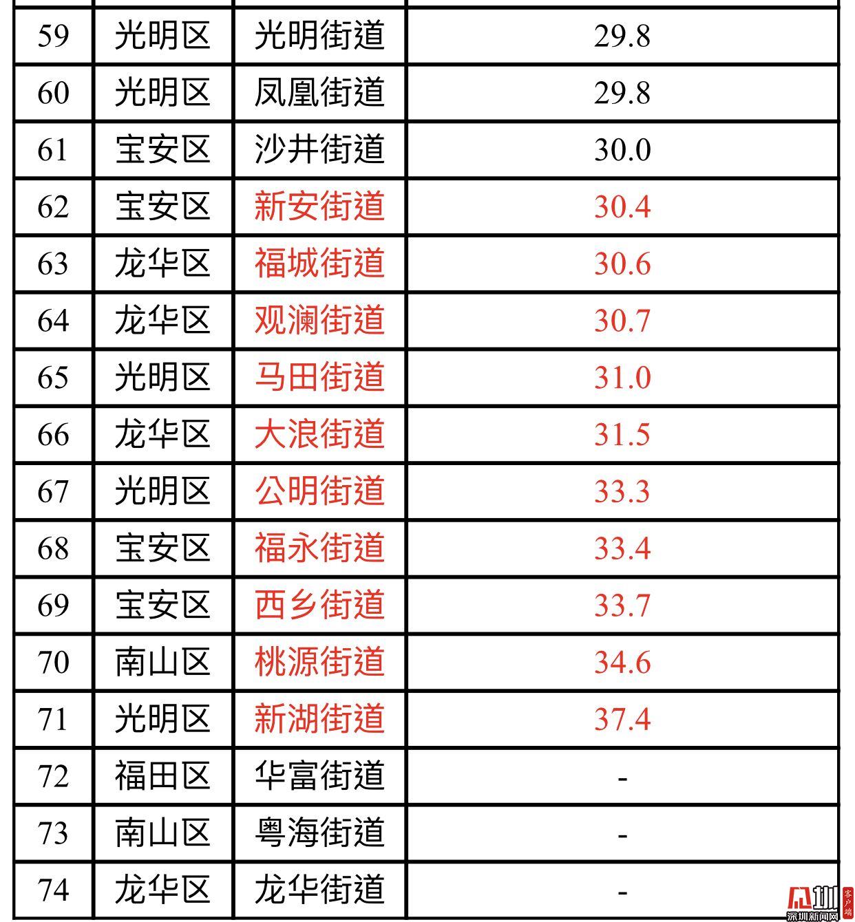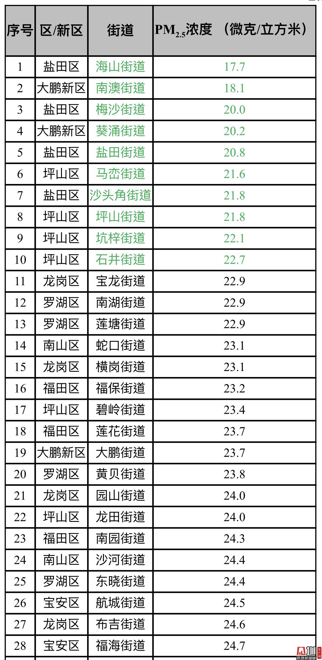 見圳客戶端·深圳新聞網(wǎng)2019年10月22日訊(見圳客戶端、深圳新聞網(wǎng)記者 陳婕)10月22日,記者從深圳市生態(tài)環(huán)境局了解到,2019年9月,全市74個街道PM2.5濃度在17.7-37.4微克/立方米之間,均值為26.1微克/立方米。排名前十的是海山、南澳、梅沙、葵涌、鹽田、馬巒、沙頭角、坪山、坑梓和石井等街道,排名倒數(shù)前十的為新湖、桃源、西鄉(xiāng)、福永、公明、大浪、馬田、觀瀾、福城和新安等街道。