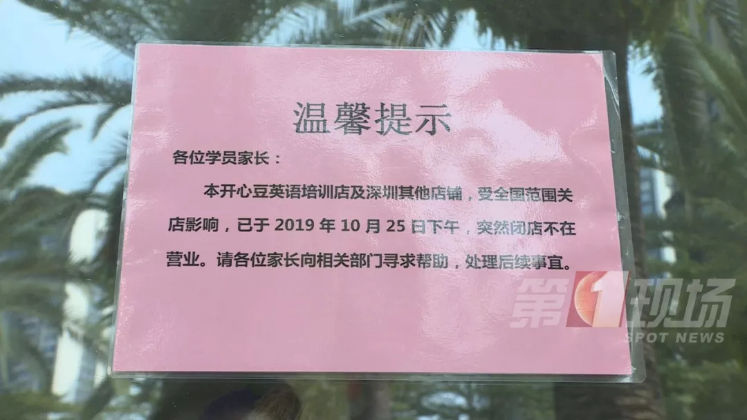 昨天上午,龍華民治綠景1866住宅區(qū)的開(kāi)心豆少兒英語(yǔ)門前,聚集了不少家長(zhǎng),但機(jī)構(gòu)大門緊鎖,上面貼的一張公告稱,機(jī)構(gòu)受全國(guó)關(guān)店潮影響,現(xiàn)已結(jié)業(yè),更令人哭笑不得的是,對(duì)于消費(fèi)者最關(guān)心的退費(fèi)問(wèn)題,卻只字未提,只是撂下一句,請(qǐng)找相關(guān)部門處理后續(xù)事宜。