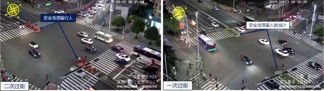 為更好地保障行人過街安全,將蓮花/景田/景田東路口高峰期南北行行人的2次過街方案改為1次過街。調(diào)整后,路口延誤分別為50.1秒、54.9秒,上升了9.6%;中間過街島滯留人數(shù)分別是1300人/小時和242人/小時,下降了81.4%;行人平均等待過街時間分別是70秒和111秒,上升58.6%;東西方向車輛平均排隊長度由36米增至102米。