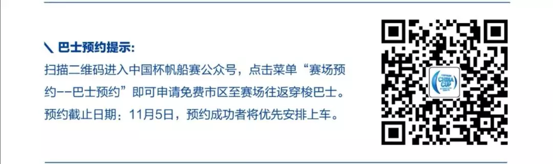 掃描二維碼進(jìn)入中國杯帆船賽公眾號,點擊菜單“賽場預(yù)約-巴士預(yù)約”,即可申請免費市區(qū)至賽場往返穿梭巴士。預(yù)約截止日期:11月5日,預(yù)約成功者將優(yōu)先安排上車。
