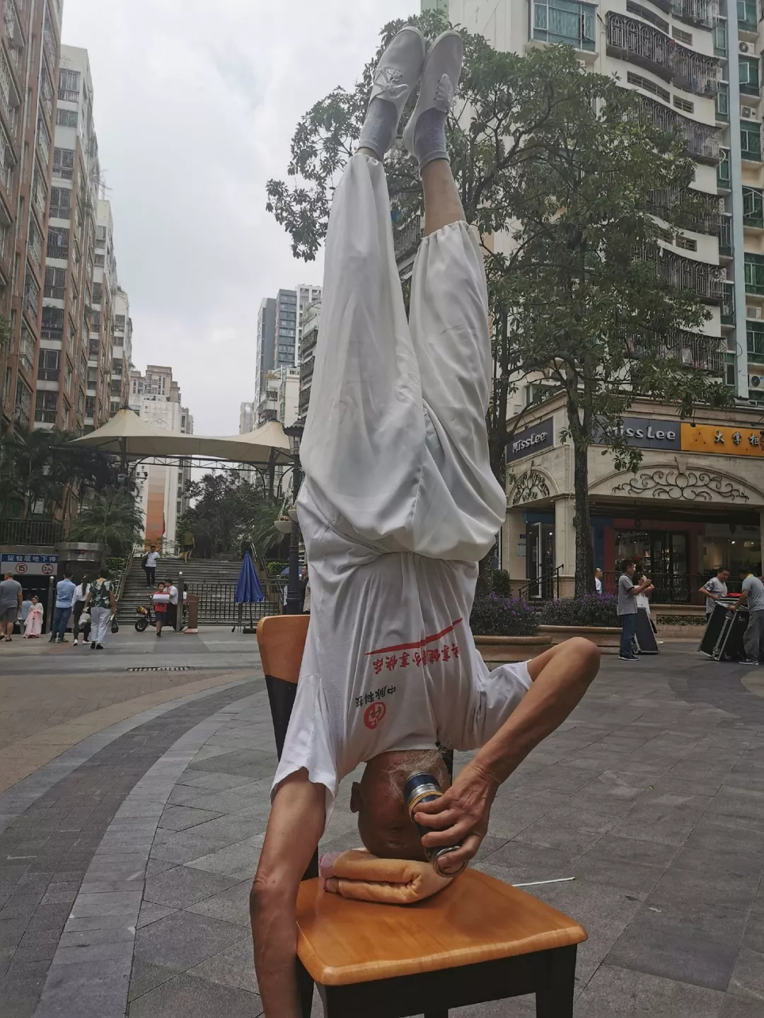 蛇口消息報(bào)2019年11月4日訊 頭著板凳倒立、雙手寫字、倒立喝水、倒立吊環(huán),倒立唱歌……做這些高難度動作的人居然是一位85歲高齡的老人。