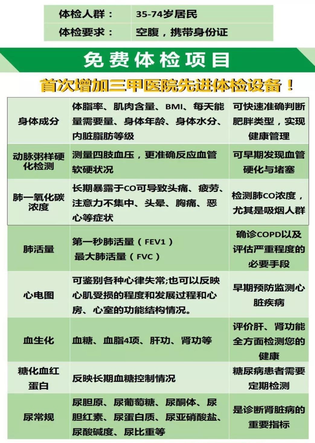 本次免費(fèi)體檢面向35-74歲深圳居民,主要為居民提供的體檢項(xiàng)目包括:免費(fèi)建立健康檔案,中醫(yī)體質(zhì)辨識(shí)服務(wù);免費(fèi)檢測(cè)尿常規(guī)、血常規(guī);免費(fèi)檢測(cè)血生化(血糖、肝功、腎功);免費(fèi)做心電圖檢查;免費(fèi)測(cè)量肺功能、肺一氧化碳含量;免費(fèi)測(cè)量身體成份,判別自身的健康狀態(tài)。需要提醒的是,體檢要求空腹,且要攜帶身份證。
