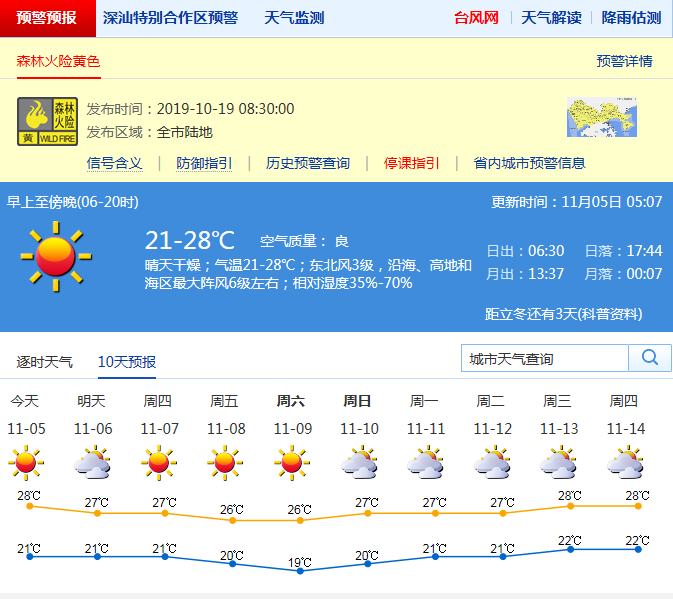 見圳客戶端·深圳新聞網(wǎng)2019年11月5日訊 深圳市氣象局預(yù)計(jì)5日晴天干燥;氣溫21-28℃;東北風(fēng)3級(jí),陣風(fēng)6級(jí);相對(duì)濕度45%-75% 。6-10日多云到晴天,空氣干燥,沿海、高地和海區(qū)最大陣風(fēng)可達(dá)7級(jí)左右,氣溫小幅波動(dòng),1字頭氣溫或?qū)⒃佻F(xiàn)。
