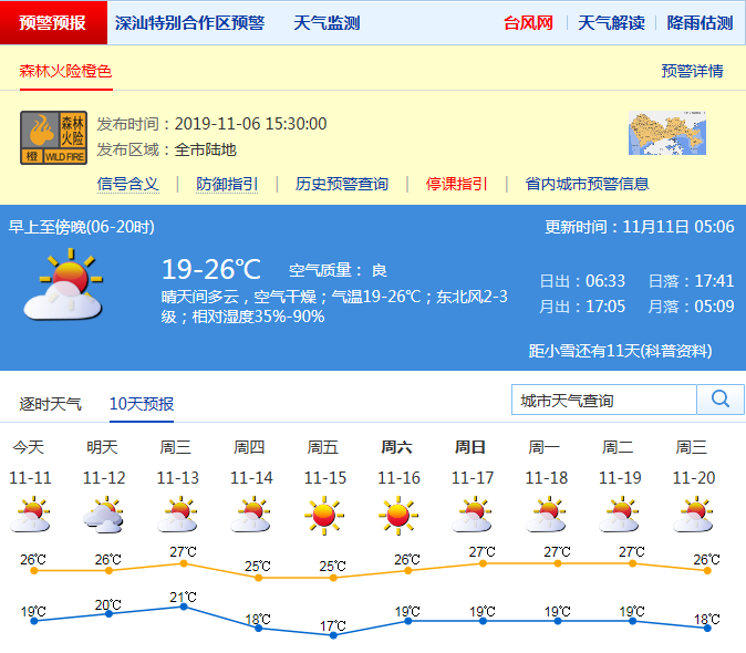 見圳客戶端·深圳新聞網(wǎng)2019年11月11日訊 最近鵬城天氣,終于有了一絲絲涼意,有點秋高氣爽的感覺了。剛剛過去的周末,全市晴天間多云,氣溫18℃-27℃。全市森林火險橙色預警信號生效中。