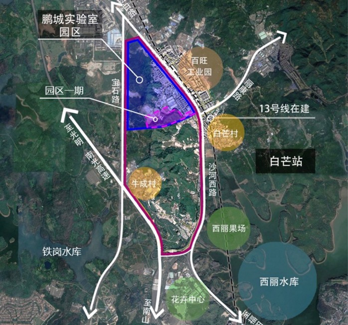 鵬城實(shí)驗(yàn)室目前以留仙洞戰(zhàn)略性新興產(chǎn)業(yè)基地萬科云城一期8棟為實(shí)驗(yàn)室過渡場(chǎng)地。規(guī)劃園區(qū)位于石壁龍園區(qū),坐落于南山西麗湖國(guó)際科教城重點(diǎn)規(guī)劃片區(qū)—石壁龍片區(qū)。距離深圳寶安機(jī)場(chǎng)12公里,距離規(guī)劃中的西麗高鐵站6公里,對(duì)外交通十分便利。同時(shí),基地被鐵崗水庫(kù)、羊臺(tái)山森林公園、西麗水庫(kù)環(huán)繞,自然環(huán)境優(yōu)勢(shì)明顯。并且項(xiàng)目靠近深圳大學(xué)城,科研創(chuàng)新氛圍濃厚。