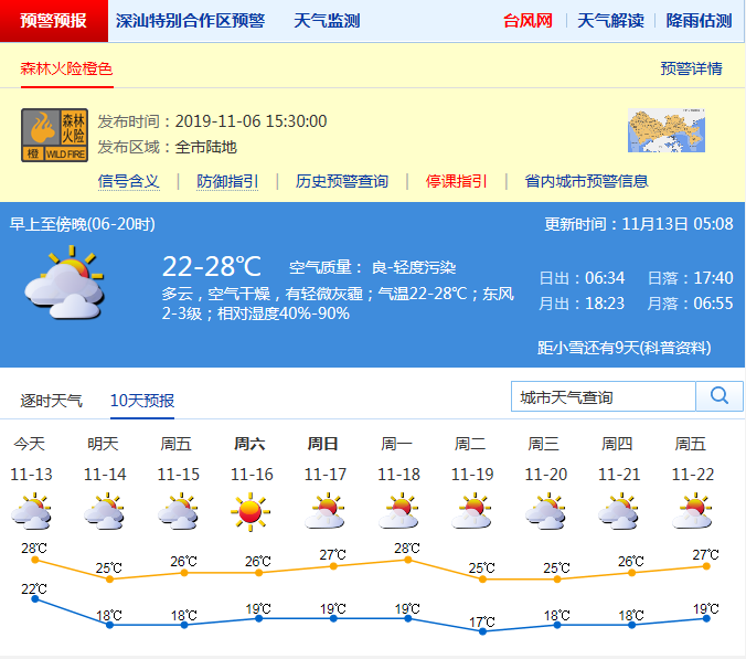 但,據(jù)深圳市氣象局消息,13日多云,早晚清涼,氣溫21-28℃,部分時(shí)段有輕微灰霾。13日夜間-14日受冷空氣影響,氣溫下降2-3℃,北風(fēng)加大,沿海、高地和海區(qū)最大陣風(fēng)7級(jí)左右。15-17日晴天干燥,風(fēng)力減弱。18日-19日受新一股冷空氣影響,北風(fēng)再次加大,氣溫明顯下降,深圳有望入秋。
