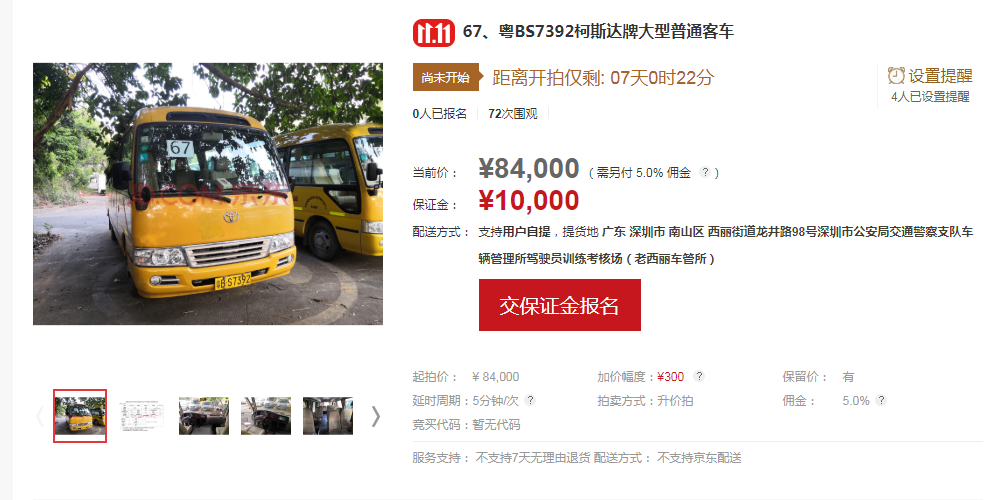 競(jìng)買(mǎi)人應(yīng)于拍賣(mài)會(huì)前在京東拍賣(mài)平臺(tái)進(jìn)行實(shí)名登記注冊(cè),注冊(cè)成功后請(qǐng)按京東拍賣(mài)平臺(tái)的提示進(jìn)行操作;競(jìng)買(mǎi)人在對(duì)拍賣(mài)標(biāo)的物首次確認(rèn)出價(jià)競(jìng)拍前,按系統(tǒng)提示報(bào)名繳納10000元/輛的保證金;在競(jìng)價(jià)過(guò)程中,請(qǐng)競(jìng)買(mǎi)人按規(guī)定的加價(jià)幅度300元出價(jià),若自行出價(jià),請(qǐng)仔細(xì)核對(duì)好出價(jià)金額,若出現(xiàn)出價(jià)金額錯(cuò)誤的情況,由買(mǎi)受人自行承擔(dān)后果;拍賣(mài)成交后,買(mǎi)受人請(qǐng)于拍賣(mài)成交之時(shí)起72小時(shí)內(nèi)全額支付拍賣(mài)成交價(jià)款、拍賣(mài)傭金、增值稅及附加、機(jī)動(dòng)車(chē)轉(zhuǎn)移登記車(chē)牌費(fèi),并到廣東華士德(深圳)拍賣(mài)行有限公司所在地(深圳市羅湖區(qū)中興路219號(hào)華興酒店4樓)簽署《拍賣(mài)成交確認(rèn)書(shū)》及辦理相關(guān)手續(xù)。