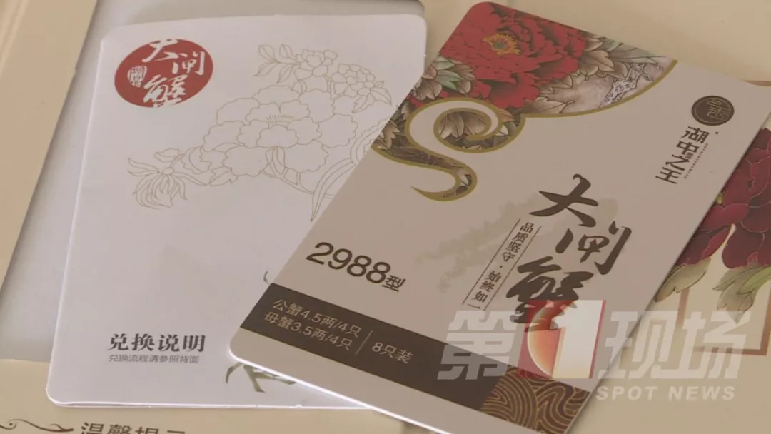 “蟹券上寫明母蟹175克,拿了兩只去稱重,帶上繩子的重量分別只有146克、156克,兩只大閘蟹都不足稱。