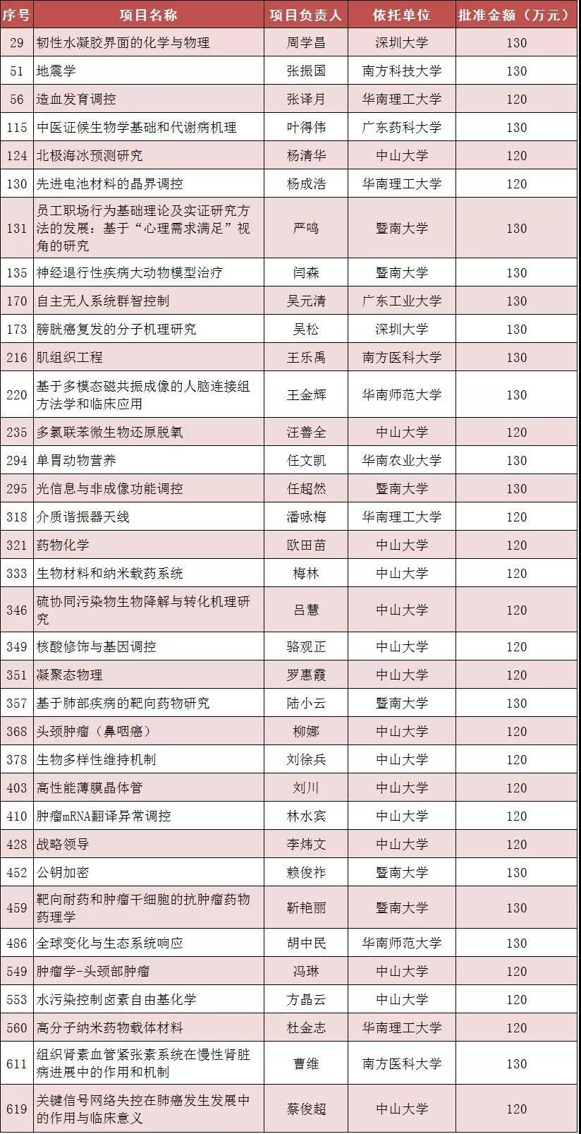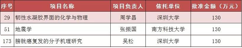 深圳大學(xué)2個,分別是:韌性水凝膠界面的化學(xué)與物理(項目負責(zé)人:周學(xué)昌);膀胱癌復(fù)發(fā)的分子機理研究(項目負責(zé)人:吳松);