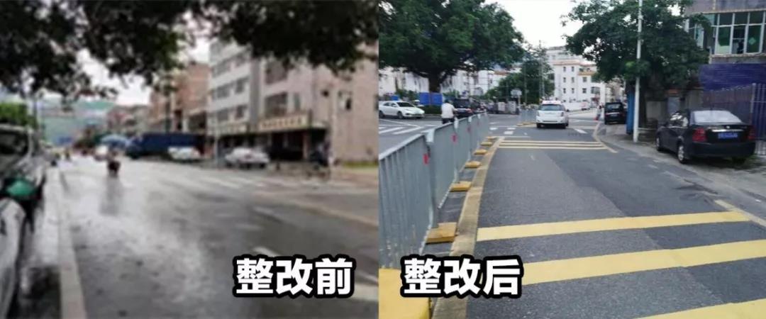 沙坑二路學校周邊路口整改前后對比。在今年新開學的竹坑、錦龍等學校周邊也完善了減速帶、限速標志、反光鏡等設施,不但限制了車輛行駛速度,也消除了路口交會處的視覺盲區(qū)