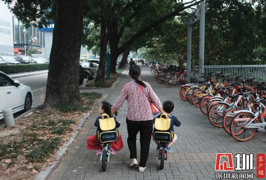 2019年10月28日,福田區(qū),放學路上,一位家長帶著兩位小朋友。