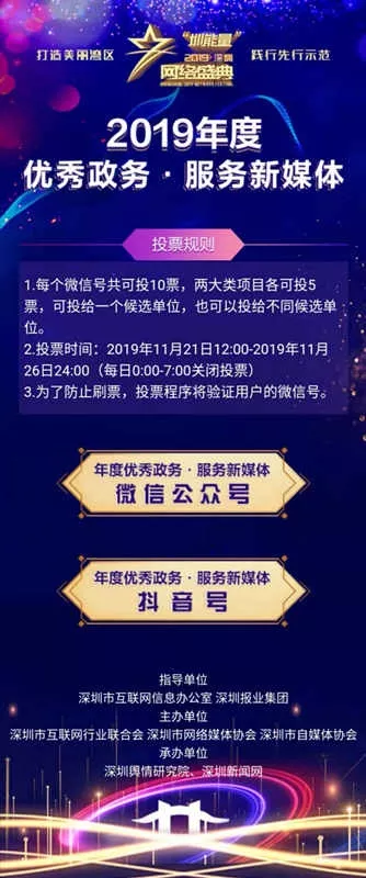 為盤點(diǎn)行業(yè)一年來(lái)取得的新探索、新成就、新經(jīng)驗(yàn),唱響主旋律,弘揚(yáng)正能量,“‘圳能量’2019深圳網(wǎng)絡(luò)盛典”——暨深圳年度優(yōu)秀政務(wù)·服務(wù)新媒體活動(dòng)將于2019年12月6日隆重舉行。